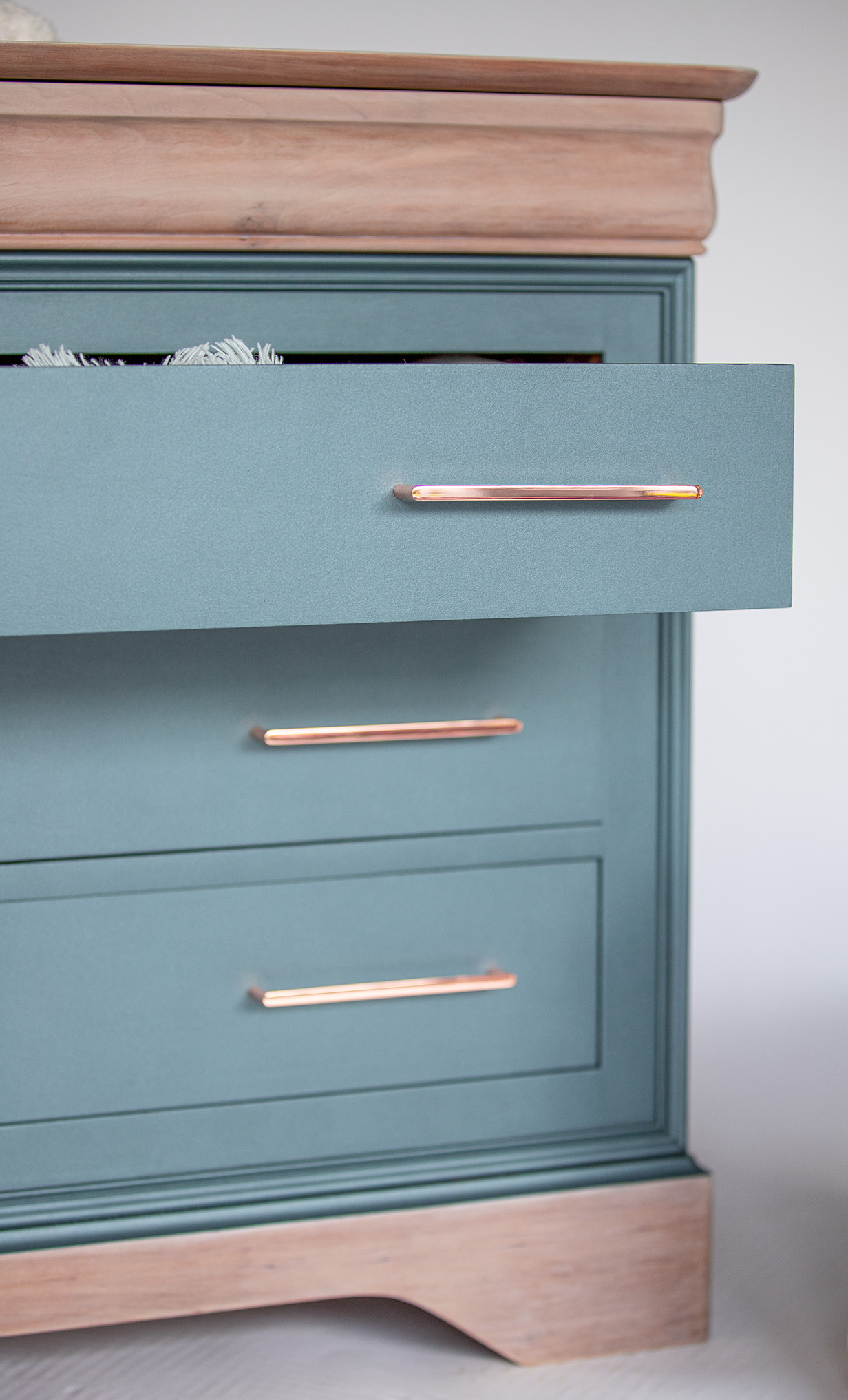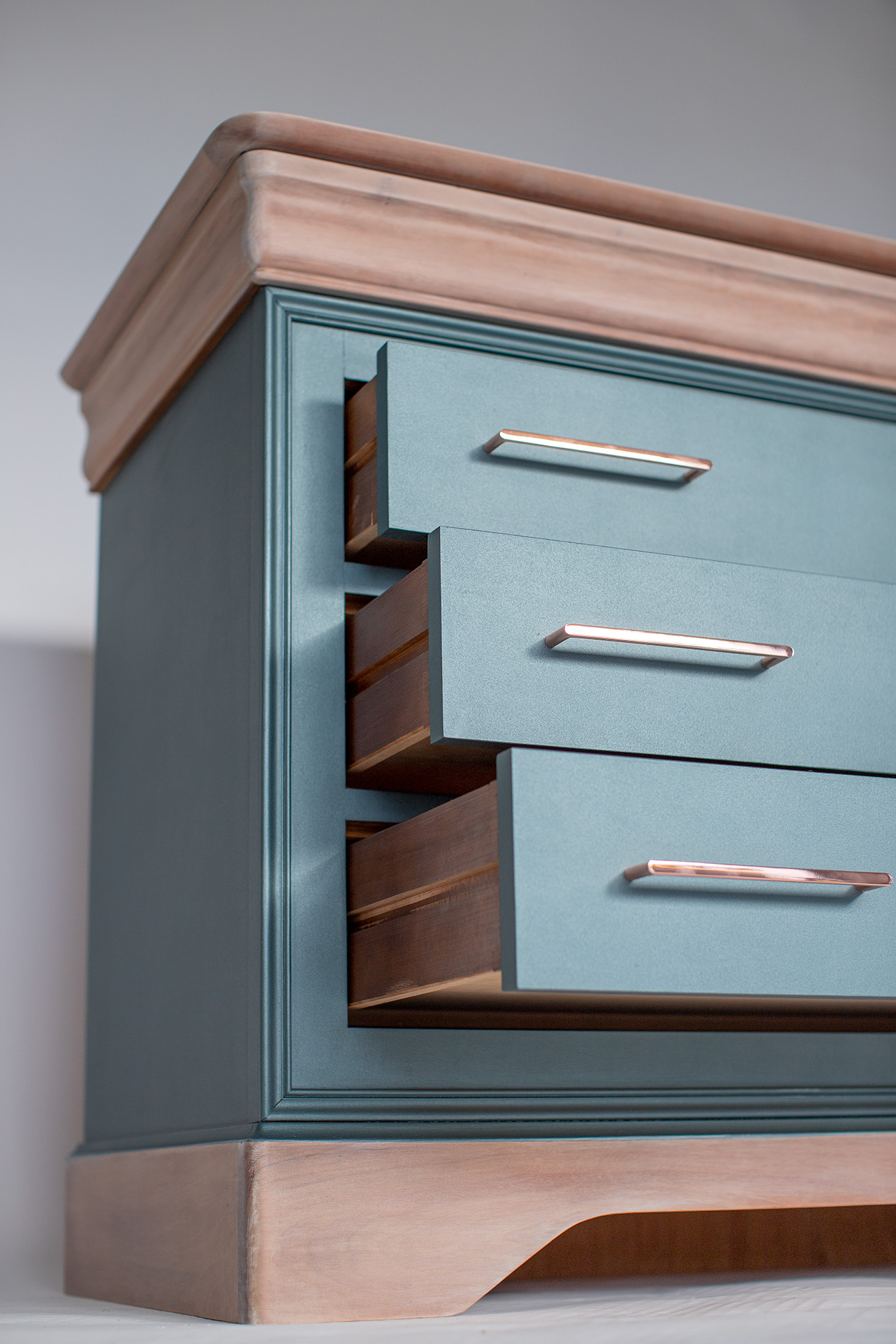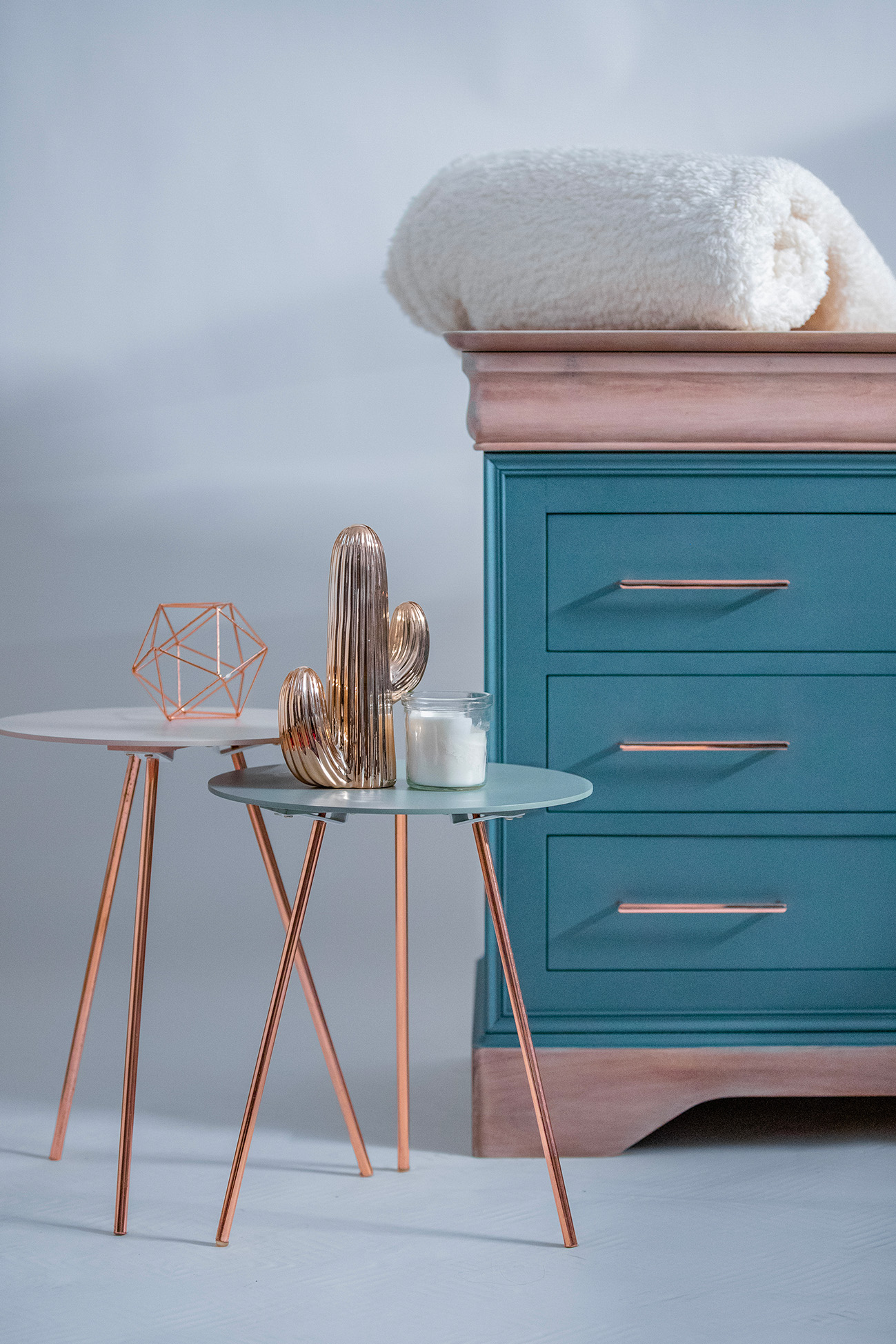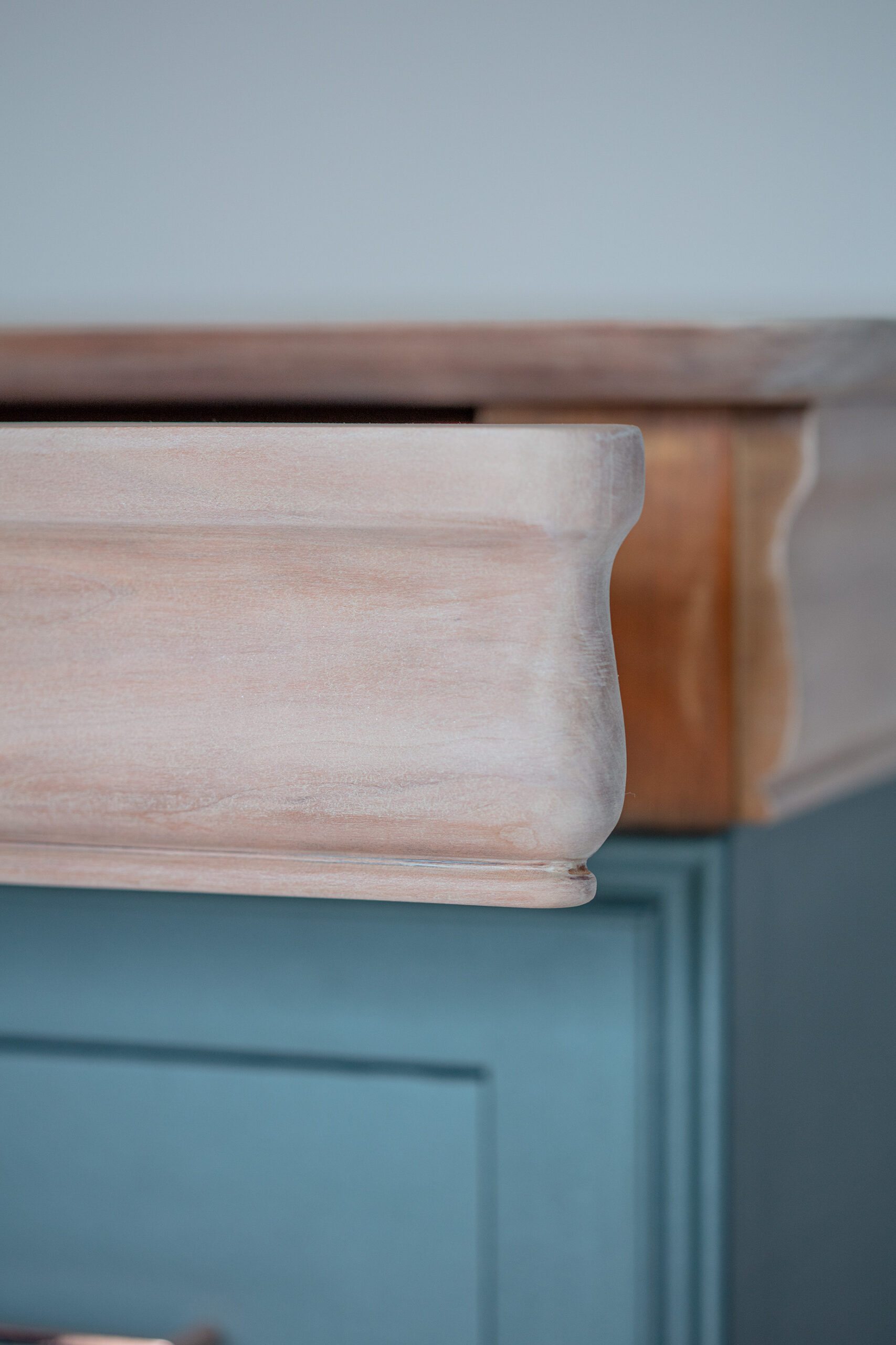 La peinture utilisée @liberon_officiel , lui confère une teinte bleu cosmos métallisé qui attire tous les regards. De plus, un effet bois flotté est créé grâce à une autre teinte de la même marque, appliquée sur le plateau et les pieds du meuble.